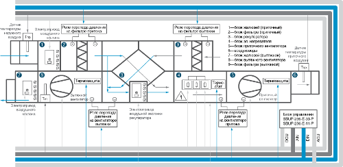 Пластинчатые рекуператоры предназначены для утилизации тепла (холода). Вытяжной, удаляемый из помещения, воздух, протекает в канале между пластинами теплообменника, нагревая их. Приточный воздух протекая через остальные каналы теплообменника нагревается. Теплообменник изготовлен из алюминиевых пластин, создающих систему каналов для протекания двух потоков воздуха. В теплообменнике происходит теплопередача между этими тщательно разделенными потоками с различной температурой. При данном типе рекуперации происходит полное разделение воздушных потоков, что позволяет использовать пластинчатые рекуператоры в системах с высокими требованиями к чистоте воздуха. КПД пластинчатых рекуператоров составляет около 70%, при этом перепад давления на данном элементе, как правило, не превышает 200-250 Па. Рекуператоры практически не требуют энергозатрат при эксплуатации и обладают высокой надежностью, благодаря отсутствию движущихся частей. Конструкция позволяет использовать их в при- точно-вытяжных установках как ярусного, так и смежного исполнения. На пластинах может образовываться конденсат, для слива конденсата они оборудованы отводами. В комплект входит штуцер, который устанавливается на съемную панель. Конструкция съемной панели представляет собой своеобразный поддон, в котором скапливается конденсат. Для исключения обледенения в ХПГ на теплообменнике устанавливается датчик температуры или давления, управляющий положением клапана обводного канала. Открывается обводной воздушный канал и закрывается воздушный клапан, установленный на стороне приточного воздуха. Приточный воздух проходит через обводной канал теплообменника, а вытяжной через рекуператор, нагревая при этом замерзшую поверхность теплообменника. После оттаивания и снижения перепада давления закрывается обводной канал и открывается теплообменник для прохода приточного воздуха.